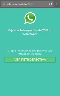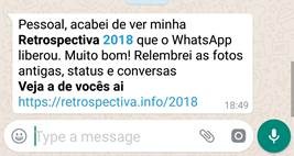 Se você receber - se é que já não chegou - uma mensagem com link para abrir uma retrospectiva de 2018 no seu WhatsApp, que mostrará imagens antigas, status e conversas, não clique. Este é mais um golpe circulando na internet.