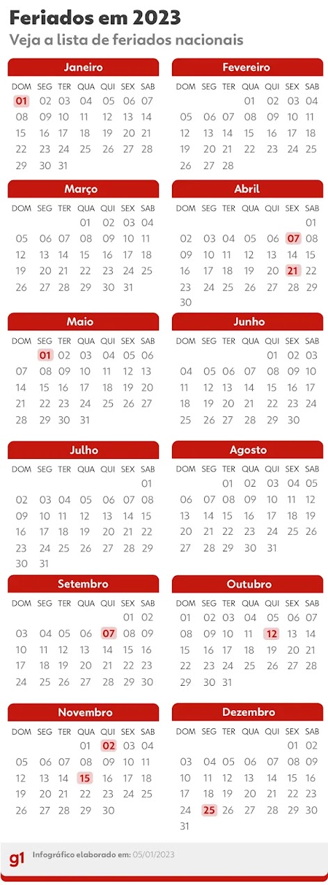 Veja abaixo a lista de feriados nacionais em 2023 e os pontos facultativos nacionais, levando em conta os dias determinados pelo governo federal.